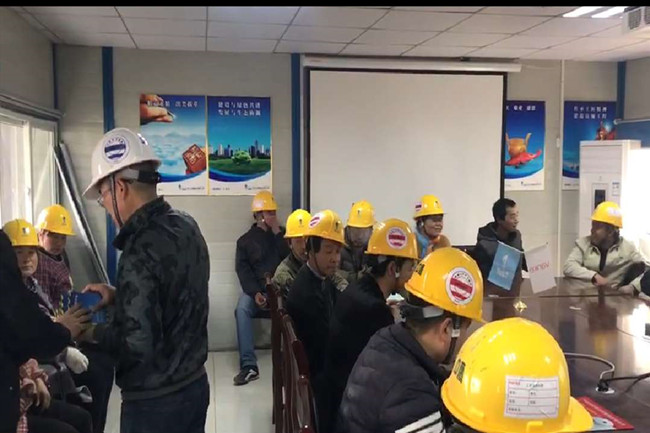 时,在项目部会议室进行消防演习总动员,发放安全生产手册,部署演习项目内容,听取消防教员讲授灭火器种类和使用方法知识。随后,全体人员紧随消防教员来到固定火源操作台前进行灭火演习。